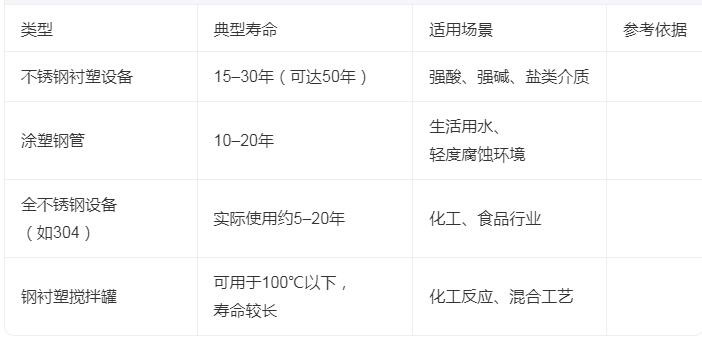 不锈钢衬塑设备的使用寿命通常在15至30年之间,在理想工况下可延长至50年以上。具体寿命受材料选择、工况条件、介质性质和维护水平等多重因素影响,不同配置和使用场景下差异显著。